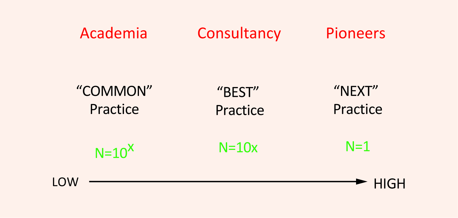 Best practice, by contrast, describes the practices pursued by perhaps a third of companies. If properly researched and popularized, best practices can influence the remaining two-thirds. Many consulting firms operate by repackaging and spreading best practice ideas to their clients. Govindarajan, however, looks for next practices, pioneering approaches which only one or a handful of companies are using. “Whereas the focus of common practice research is hypotheses testing,” he says, “the focus of next practice research is hypotheses generation.”