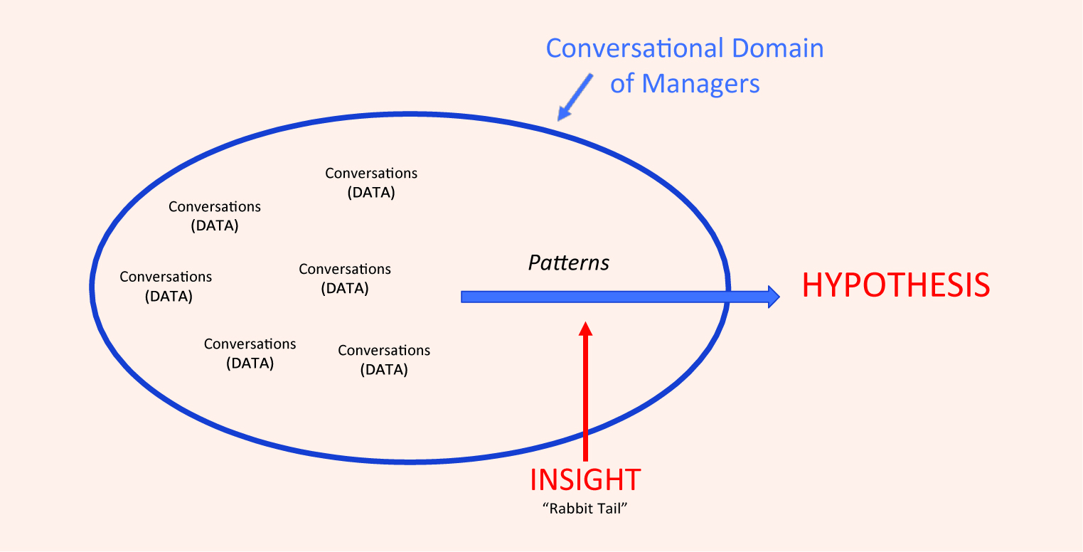 Figure 2 shows how this emergent process works. By conversing with managers, you collect data about the chosen problem and, as your discussions continue, patterns begin to emerge. You can then draw inductive insights from these patterns. Campbell described it colorfully, “It’s like the rabbit’s tail. It’s a glimpse. So, you know, a rabbit’s tail is white and when it disappears down a hole, you see that little flash of white. It’s a glimpse of what might be interesting.” From that rabbit tail insight, you can build a working hypothesis about how this problem can be solved.
