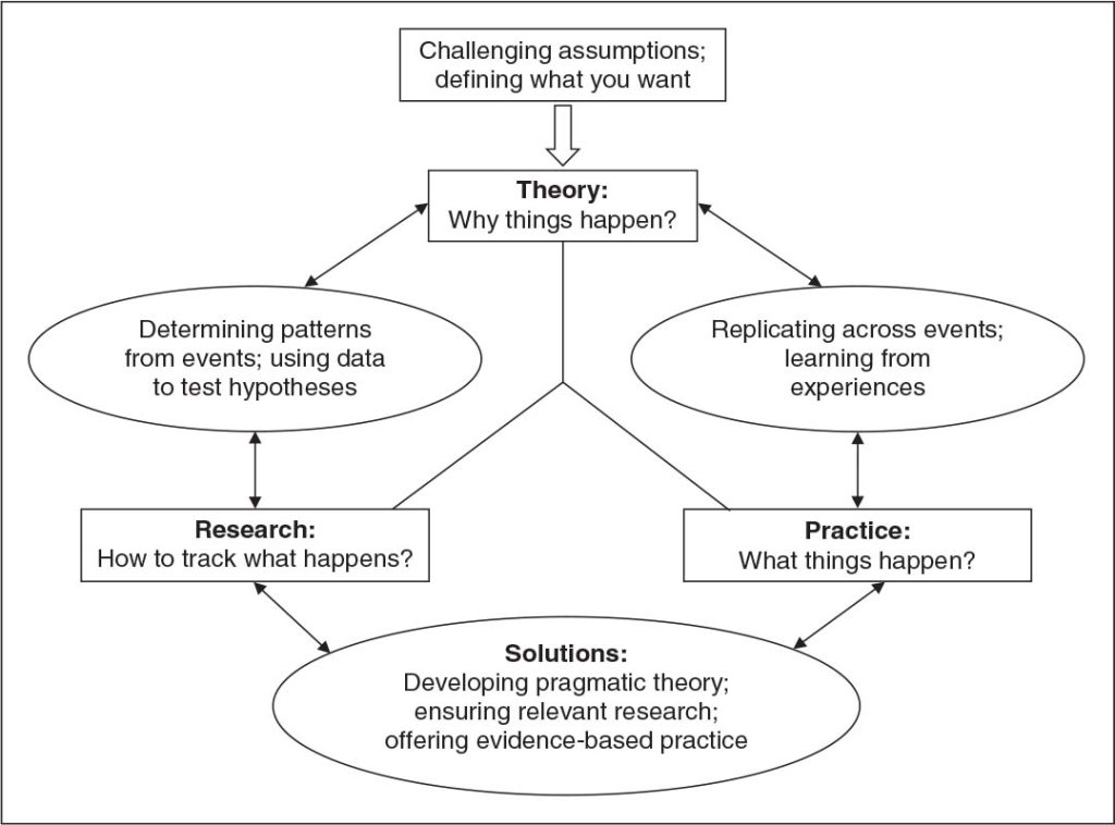 - Solutions result when theory, research, and practice come together to offer evidence-based insights that make knowledge productive.14